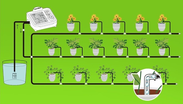 E' un sistema per bagnare il terreno delle tue piante che sfrutta la capacità di piccoli gocciolatori che distibuiscono l'acqua, goccia dopo goccia, mantenendo umido il terreno dei tuoi vasi. Gli intervalli di innaffiamento e la quantità di acqua da inviare alle piante sono regolabili a piacere.