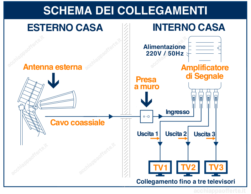 Uno schema semplice che ti spiega come collegare un amplificatore d'antenna al tuo apparecchio televisivo in casa. Segui le istruzioni e risolvi con un semplice amplificatore di segnale TV.