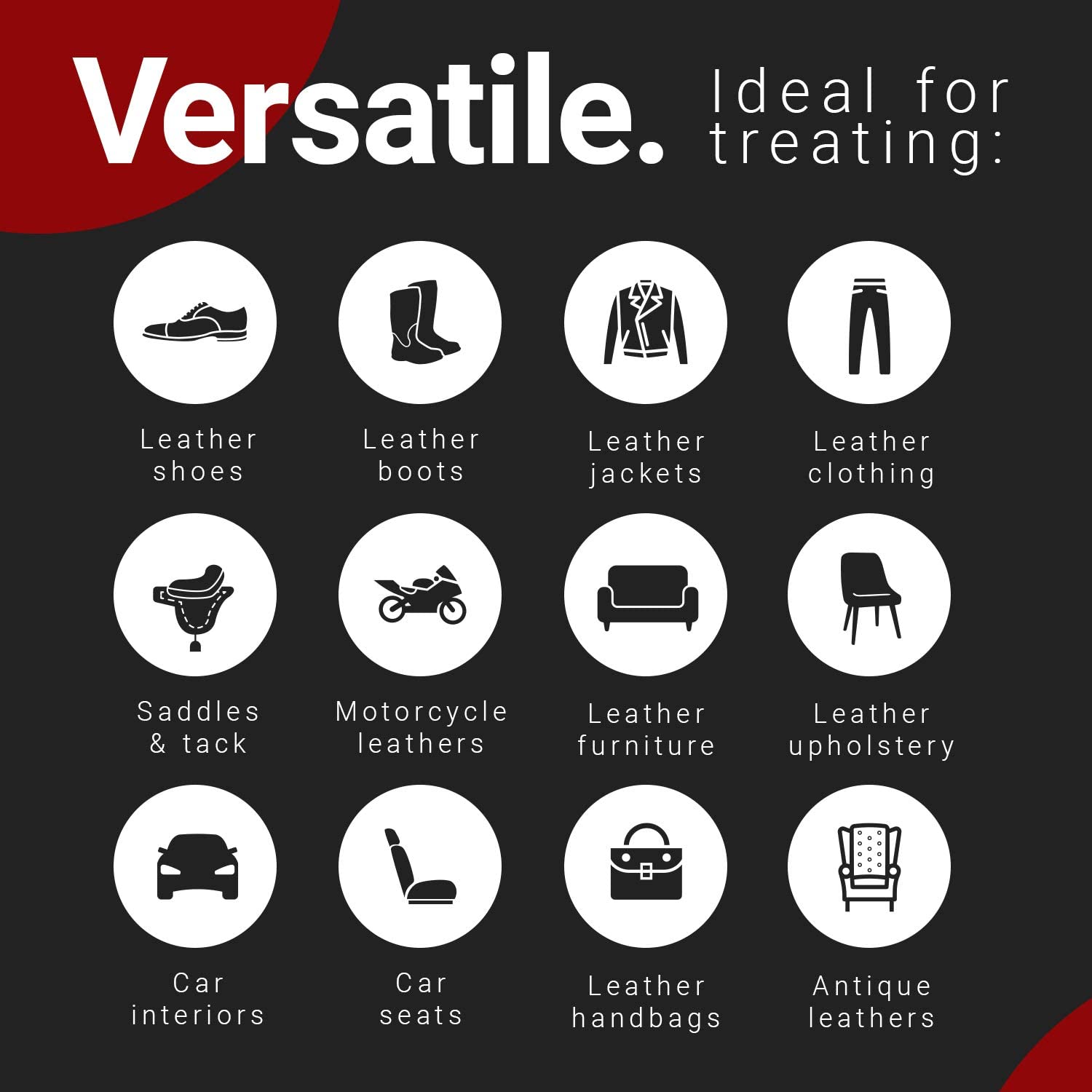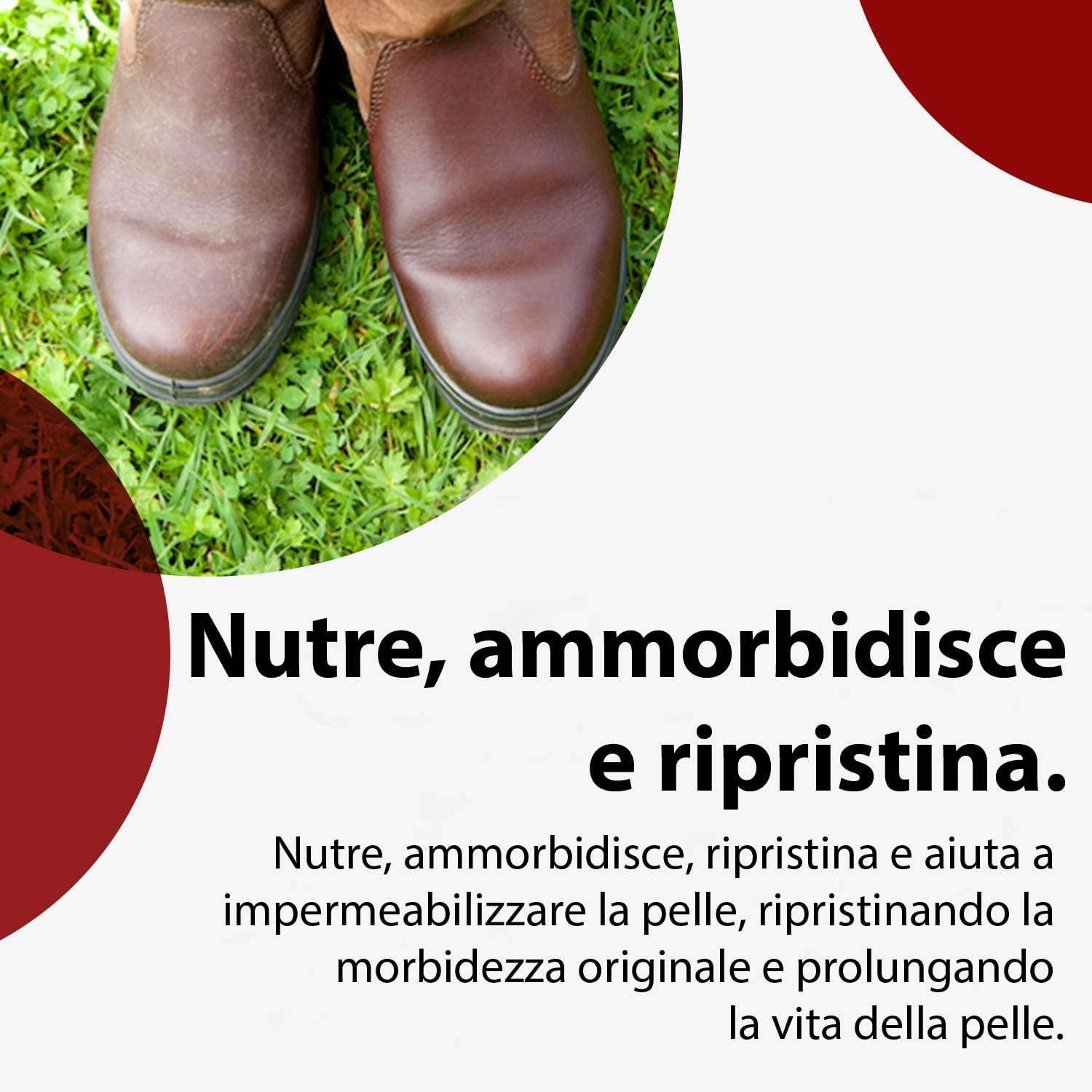 Ideale per ripristinare e impermeabilizzare scarpe in pelle, stivali, giacche, abbigliamento, selle e finimenti equestri, pelli moto, mobili e tappezzeria in pelle, interni auto, sedili auto, borse e pelle antica