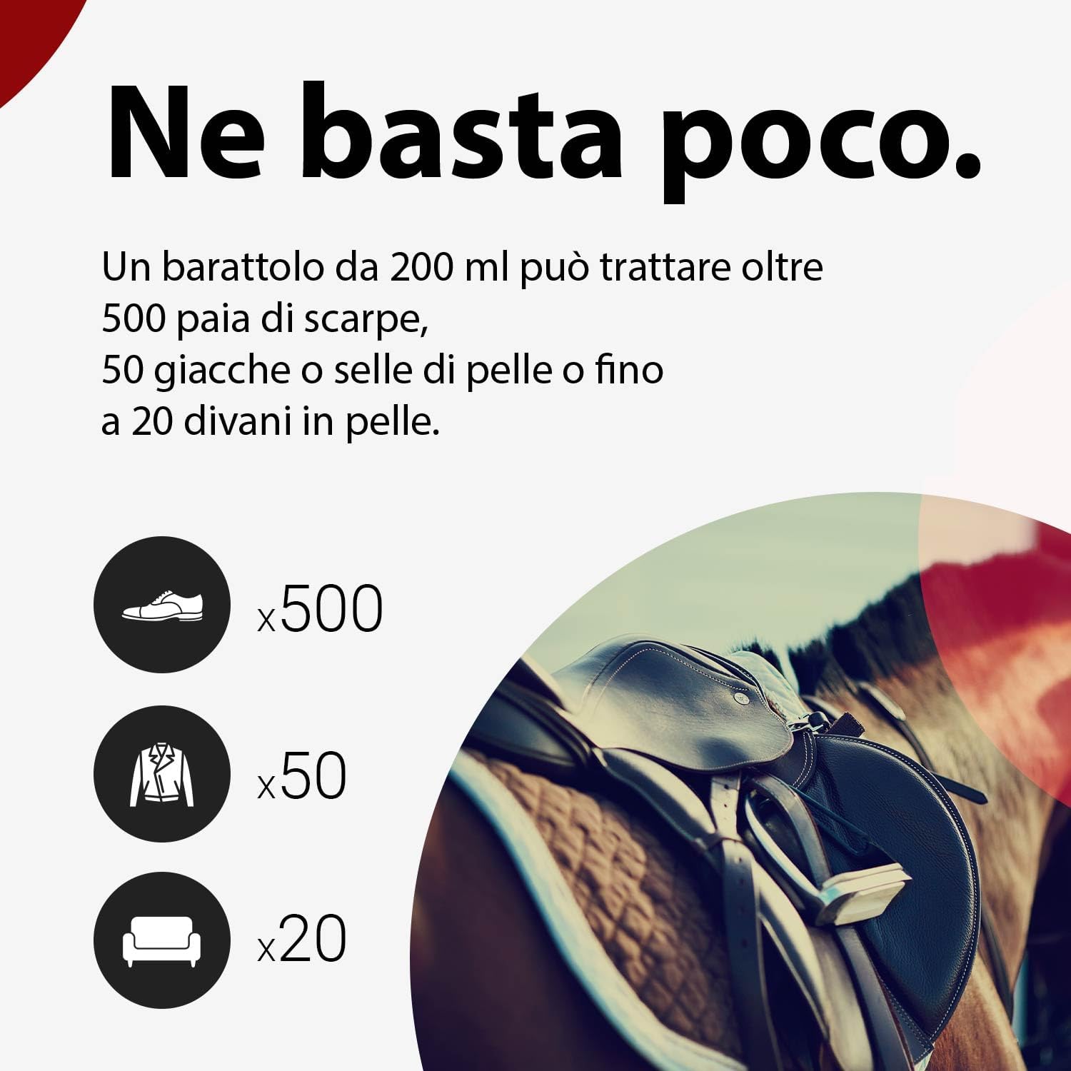 Un vaso da 200 ml può trattare oltre 500 paia di scarpe, 50 giacche o selle in pelle o fino a 20 divani in pelle; Non si secca e ha una durata di 20 anni; Questo trattamento della pelle naturale rinnova e preserva le pelli lisce e semianiline