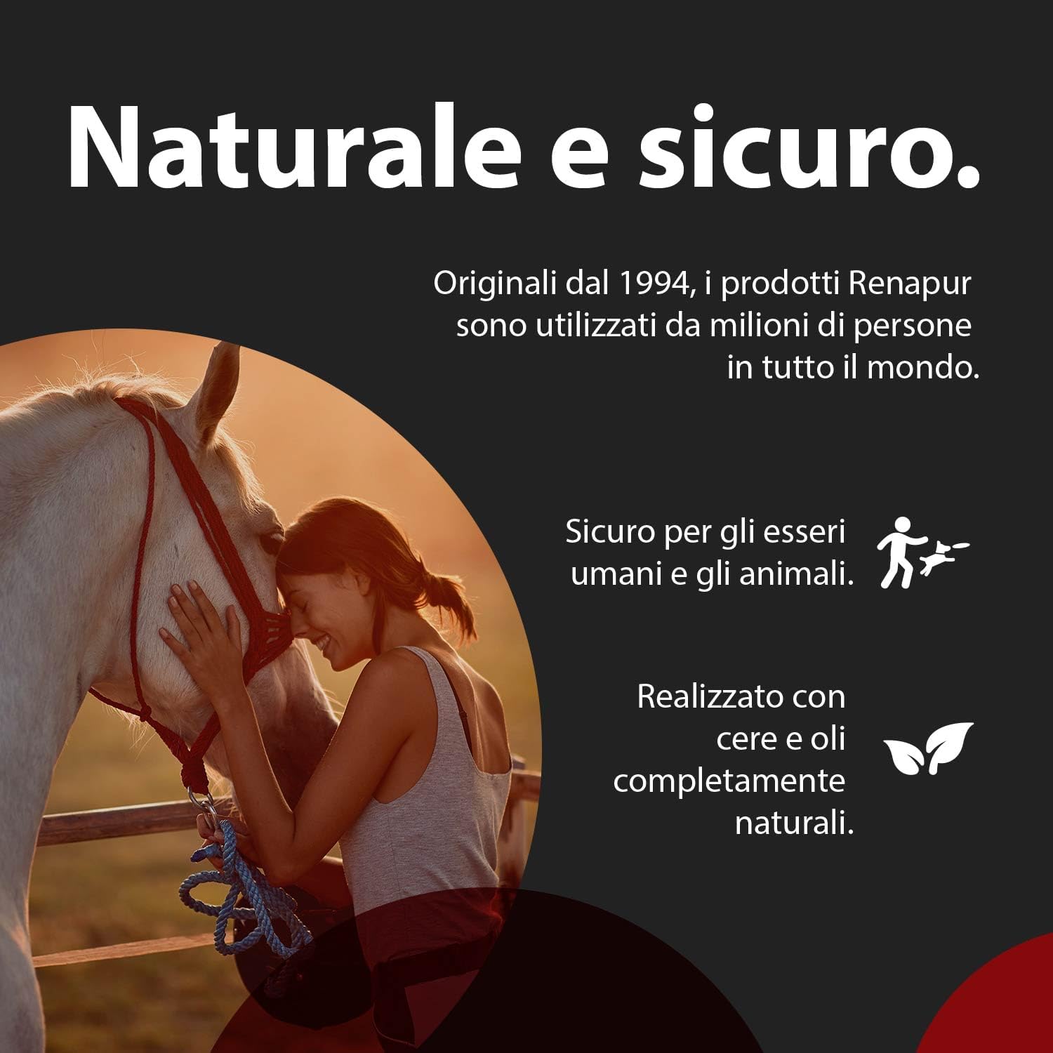 Tutti gli ingredienti sono di qualità e il prodotto è sicuro per l'uomo e gli animali. La cura della pelle Renapur è realizzata con cere e oli completamente naturali, come cera d'api, cera carnauba, olio di jojoba e olio di avocado.